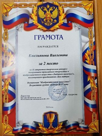 Поздравляем ученицу 1 «А» класса, Виолетту Емельянову, со II местом во II Открытом конкурсе декоративно-прикладного и изобразительного искусства «Любимой мамочке!», приуроченном ко Дню матери.