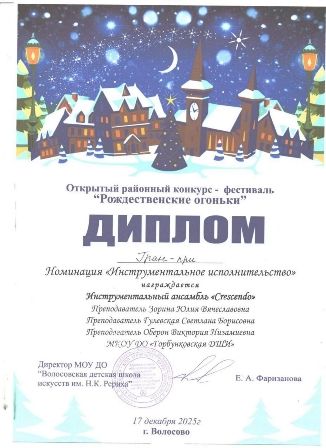 17 декабря на Открытом районном конкурсе ансамблевого исполнительства «Рождественские огоньки» в г. Волосово инструментальный ансамбль "Crescendo" (преп. Зорина Ю.В., Гулевская С.Б., Оберон В.Н.) завоевал Гран-при. Играли "Венецию" П. Мартина и новую пьесу в своем репертуаре, по словам участника ансамбля, “умопомрачительное по сложности” произведение французского композитора Р. Гальяно "Танго для Клод"