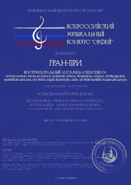- Гран - При: Инструментальный ансамбль "Crescendo".