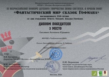 Кисленко Ангелина заняла 3‑е место во Всероссийском конкурсе детского творчества «Звуки светятся, а краски поют: Фантастический мир сказок Гофмана», приуроченном к 250‑летию со дня рождения Э. Т. А. Гофмана.