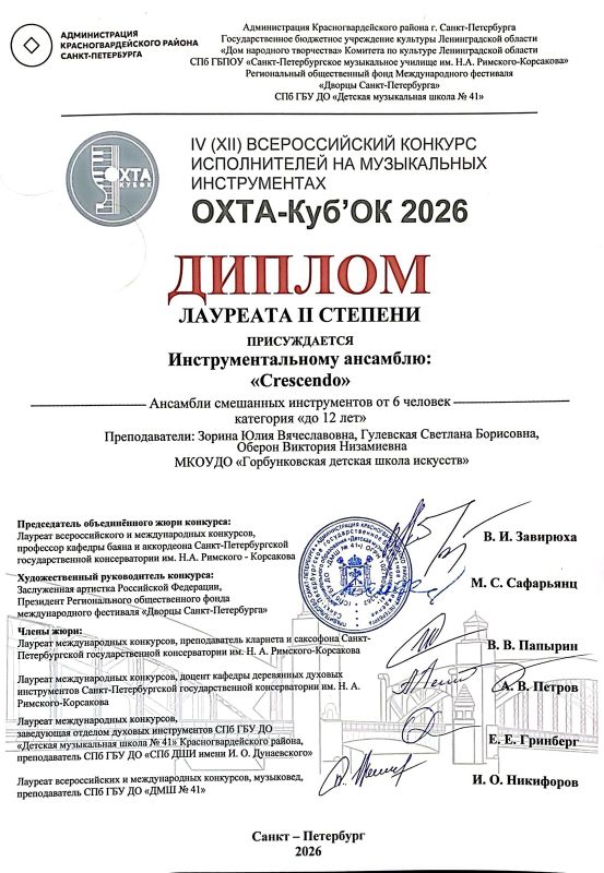 Друзья, мы делимся радостной и громкой новостью! В Санкт-Петербурге с блеском завершился IV Всероссийский конкурс «Охта-кубок-2026» — настоящий марафон талантов, который собрал под своим крылом более 350 юных дарований из 17 регионов России.