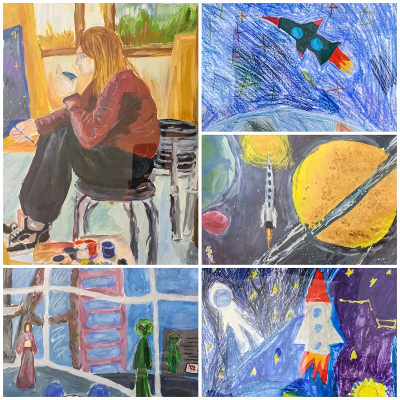 Ребята внимательно осмотрели посвящённую космосу выставку картин на первом этаже школы, составленную из лучших работ обучающихся художественного отделения. С интересом выслушали рассказ преподавателей о картинах.